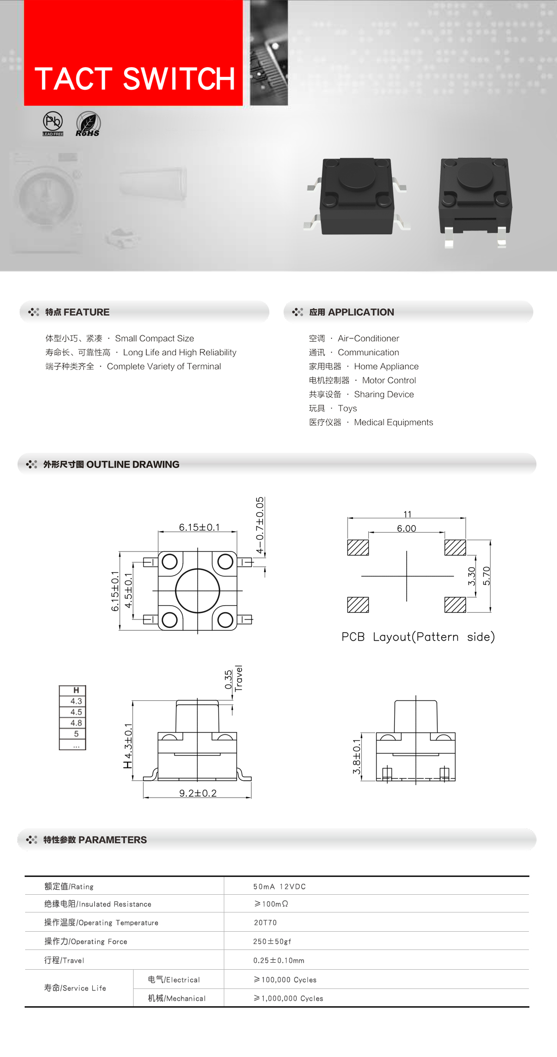 6*6系列 6.15mm防水轻触开关 平脚贴片式微型按键开关
