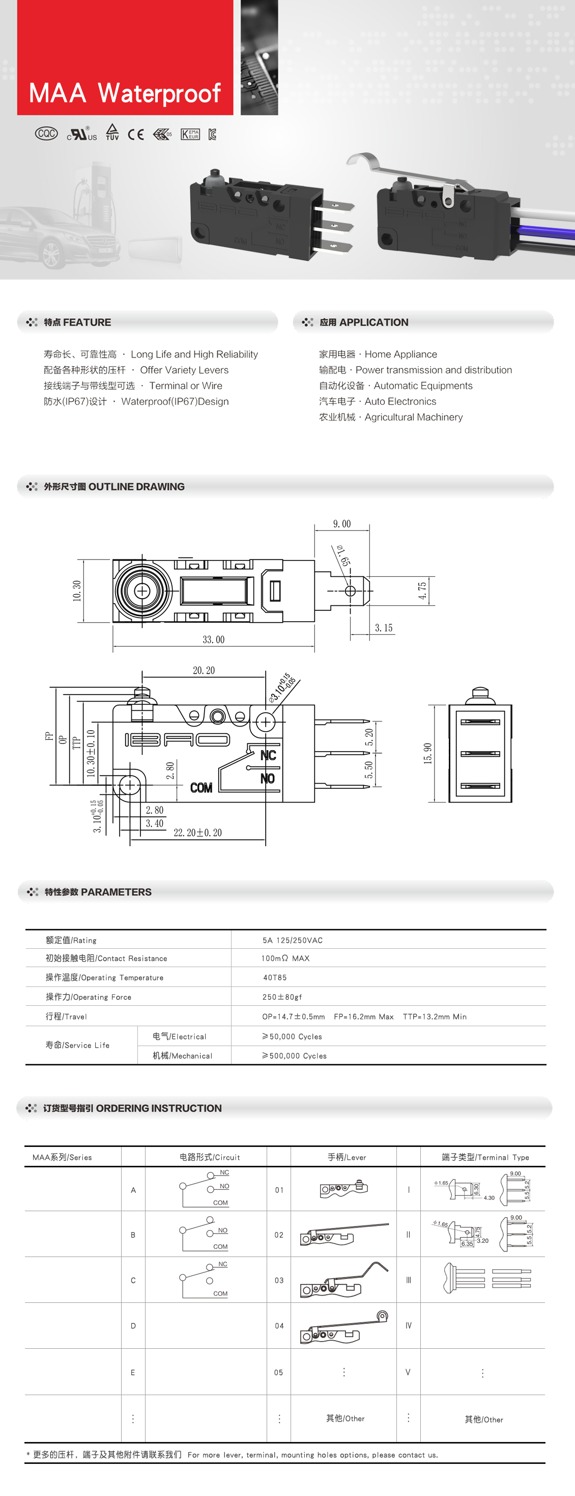 MAA系列 防水微动开关 Ⅰ型外壳 可焊线包塑