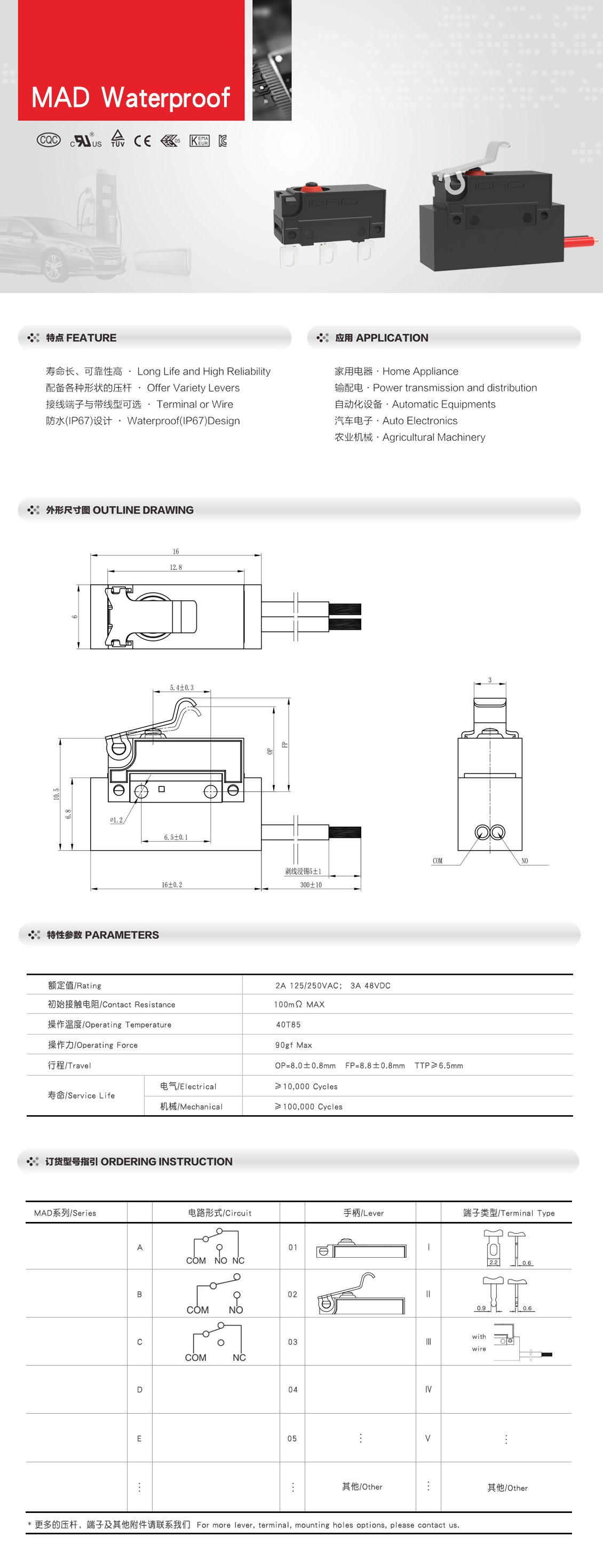 MAD系列 防水微动开关 Ⅰ型外壳 可焊线包塑