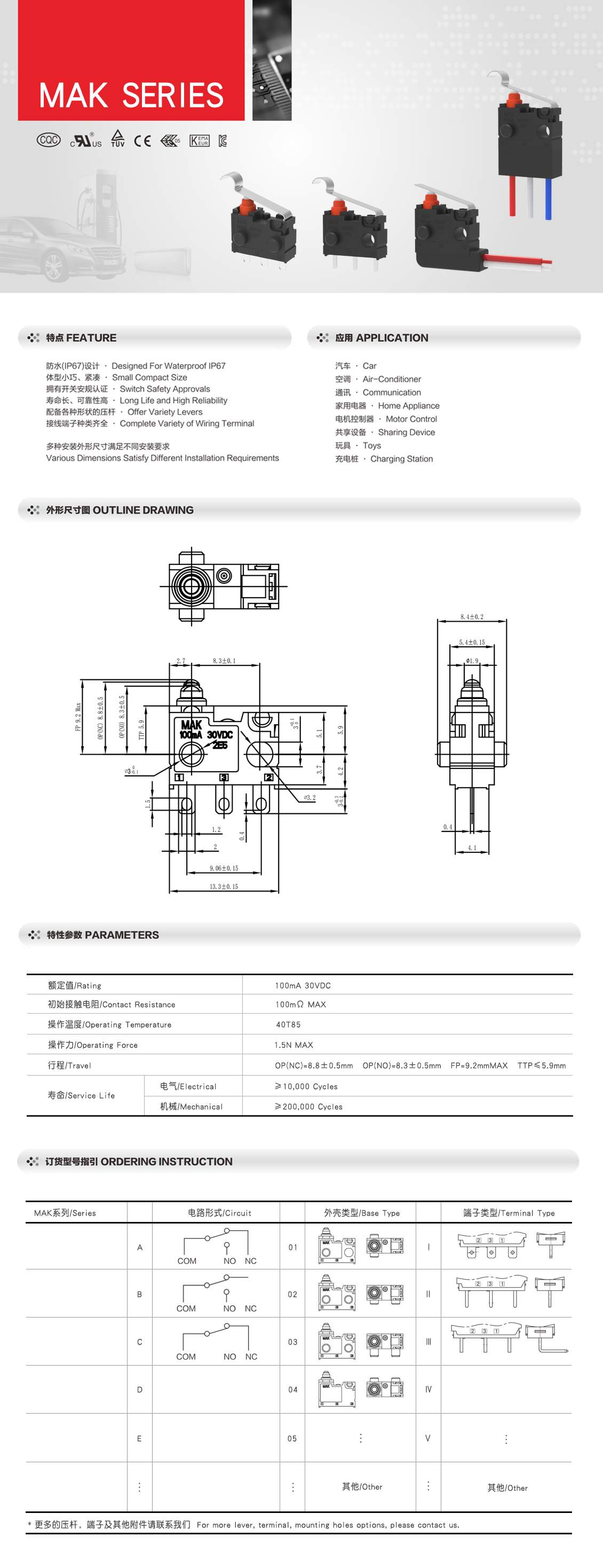 MAK系列 防水微动开关 Ⅱ型外壳 可焊线包塑