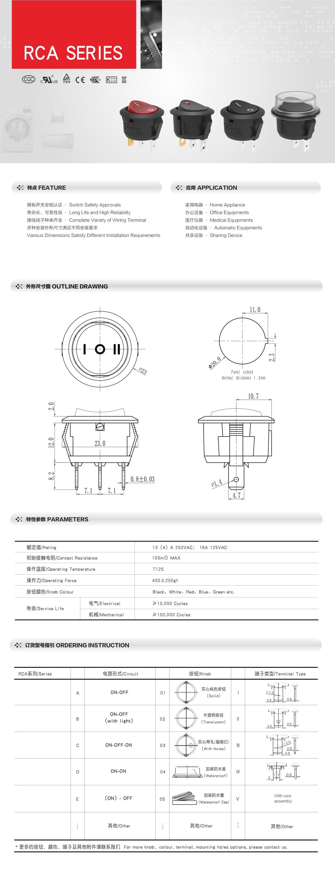 RCA系列 船型开关 圆形翘板开关猫眼灯款 多规格按钮端子