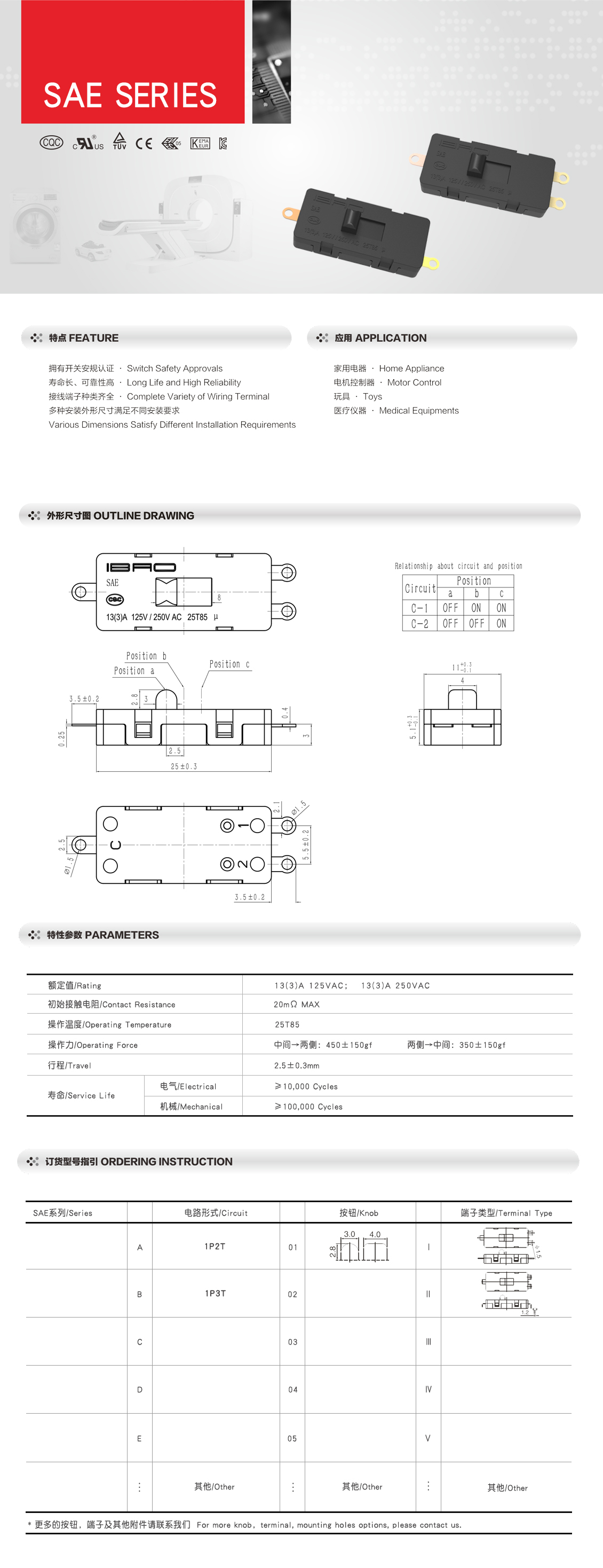 SAE系列 3脚1P3T塑料滑动开关 吹风机拨动开关